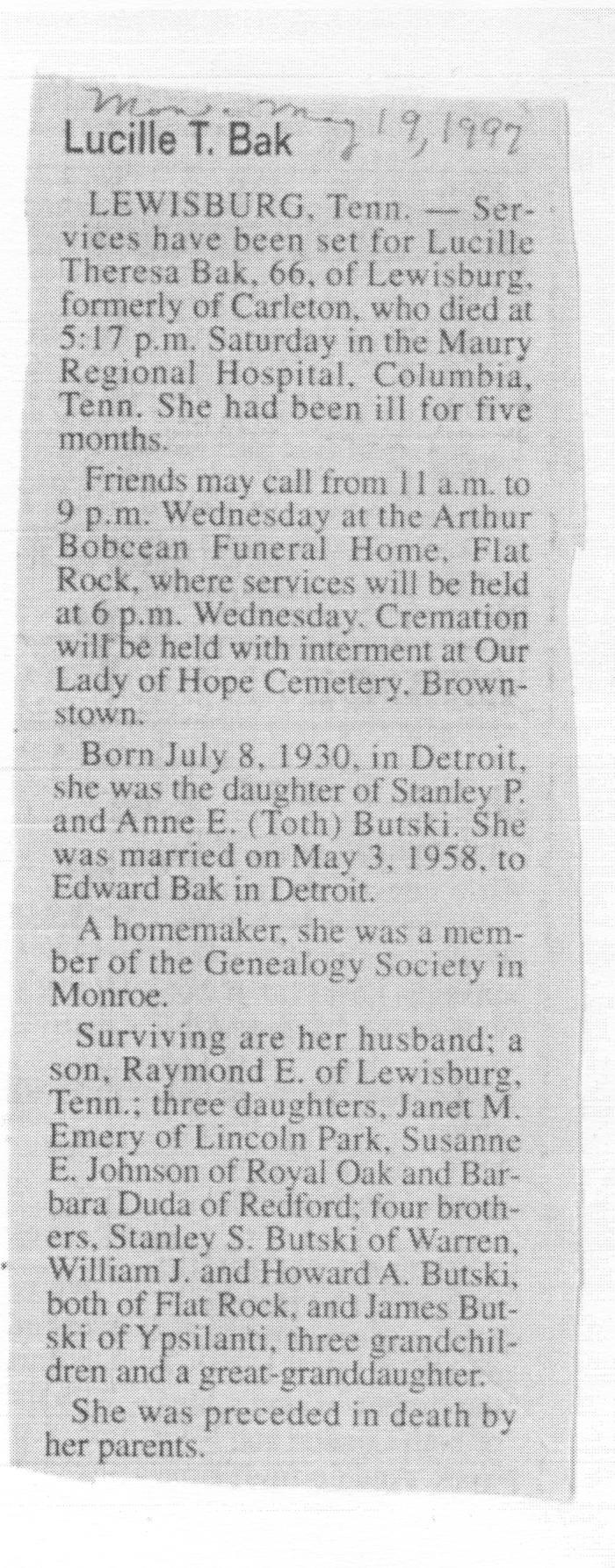 Obituary of Lucille T. Bak born July 8, 1930 in Detroit, Michigan. Resided in Carleton, Michigan.