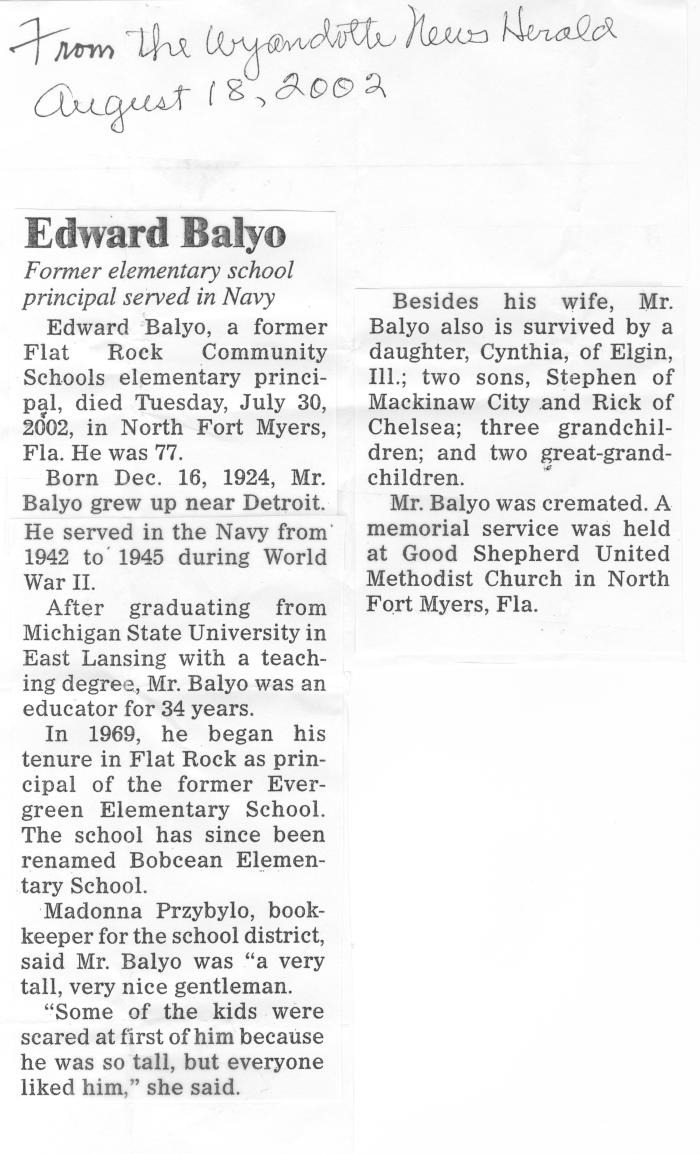 Obituary of Edward Balyo born December 16, 1924 in Detroit, Michigan. Resided in Flat Rock, Michigan.