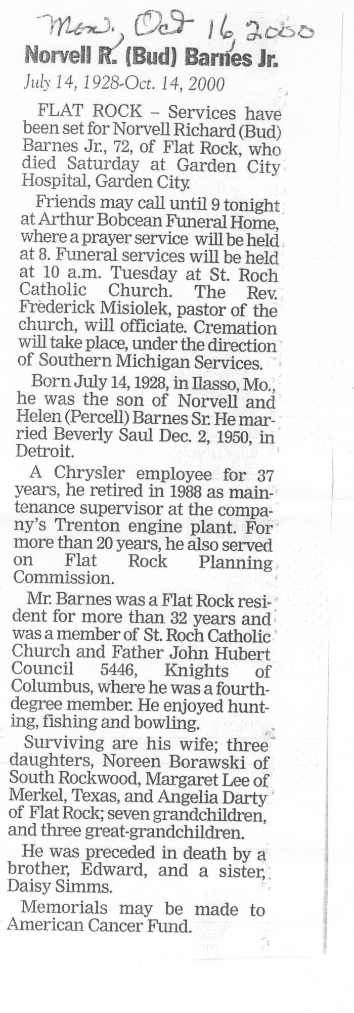 Obituary of Norvell R. Bud Barnes Jr.born July 14, 1928 in Ilasso, Missouri. Resided in Flat Rock, Michigan.
