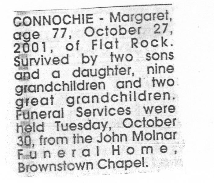 Obituary of Margaret Connochie born Nov. 1925 in Michigan. Resided in Flat Rock, Michigan.