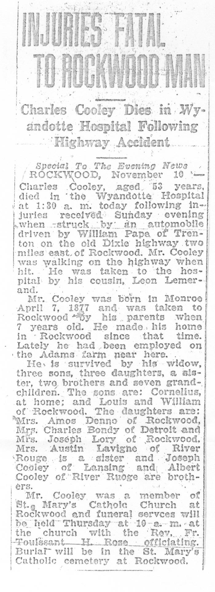Obituary of Charles Cooley born April 7, 1877 in Monroe, Michigan. Resided in Rockwood, Michigan.
