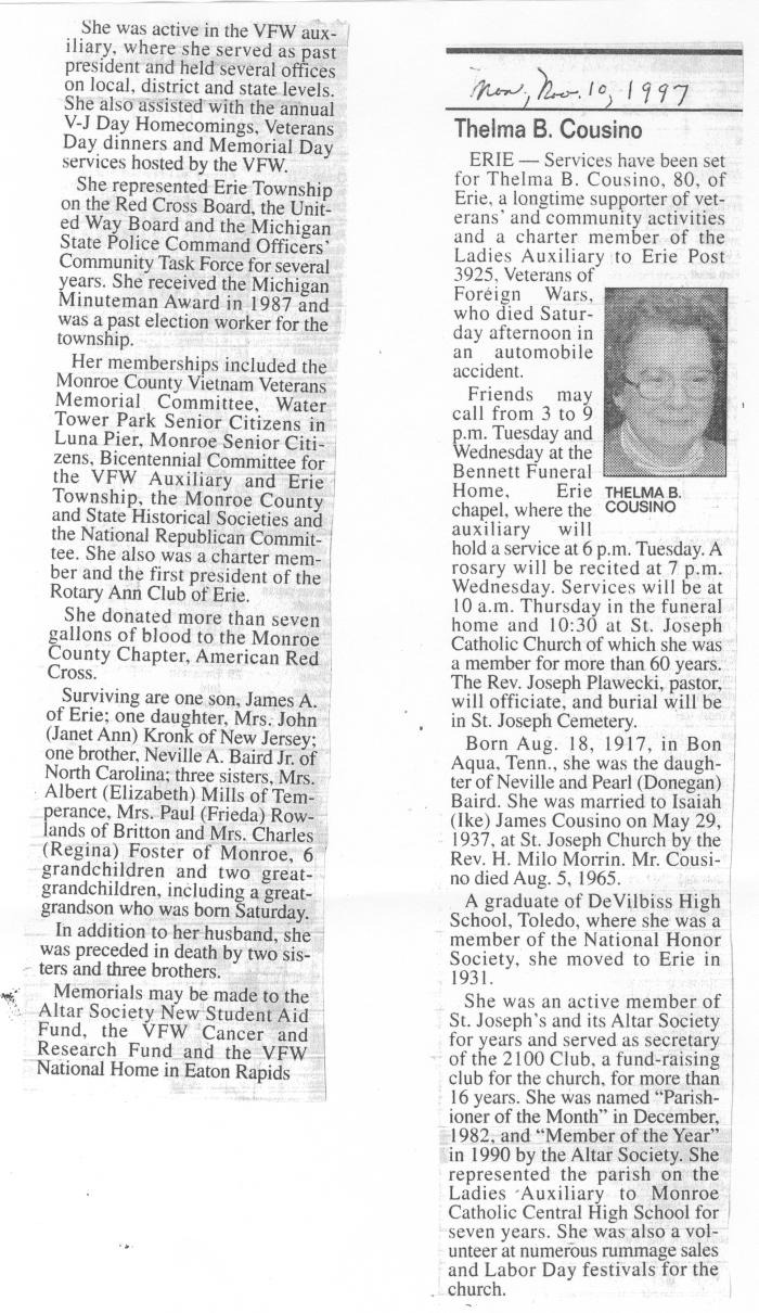 Obituary of Thelma B. Cousino born Aug. 18, 1927 in Bon Aqua , Tennesee. Resided in Erie, Michigan.