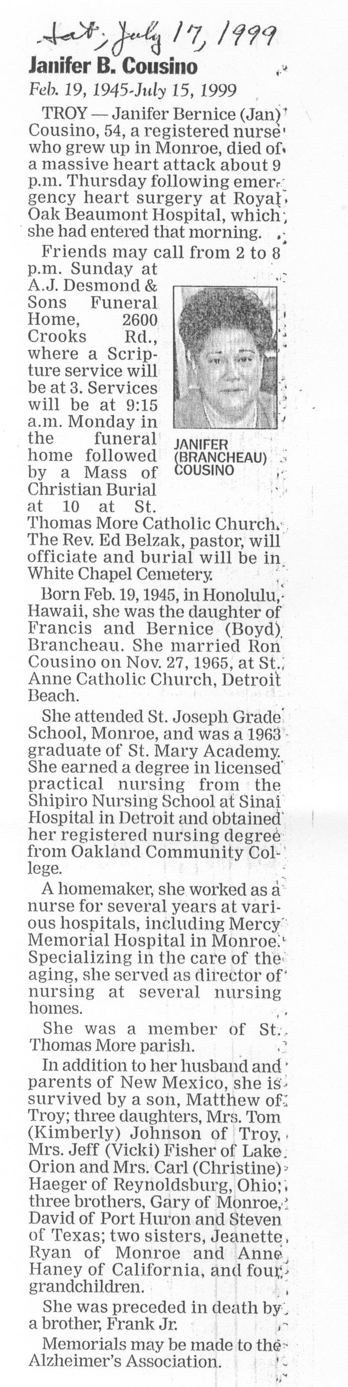 Obituary of Janifer Bernice Cousino born Feb. 19, 1945 in Honolulu, Hawaii. Resided in Monroe, Michigan.