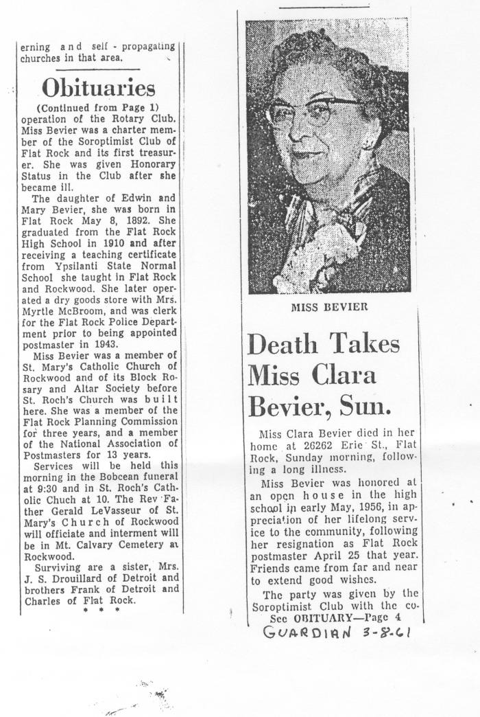 Obituary of Miss Clara Bevier born May 8, 1892 in Flat Rock, Michigan. Resided in Flat Rock, Michigan.