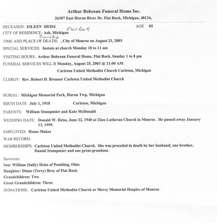Obituary of Eileen Heiss born July 1, 1918 in Carleton, Michigan. Resided in Ash Township, Michigan.