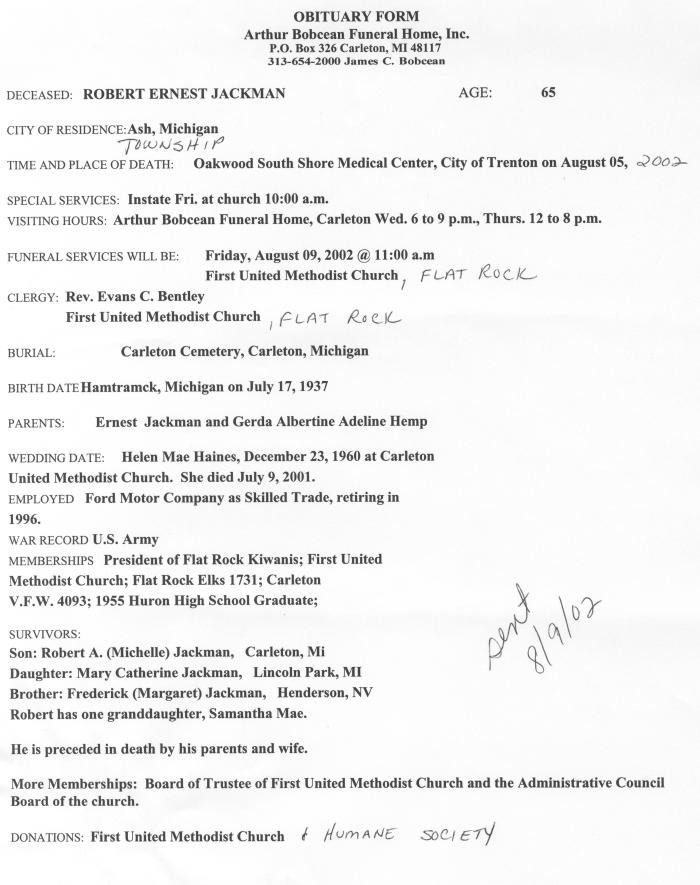 Obituary of Robert Ernest Jackson born July 17, 1937 in Hamtramack, Michigan. Resided in Ash Township, Michigan.