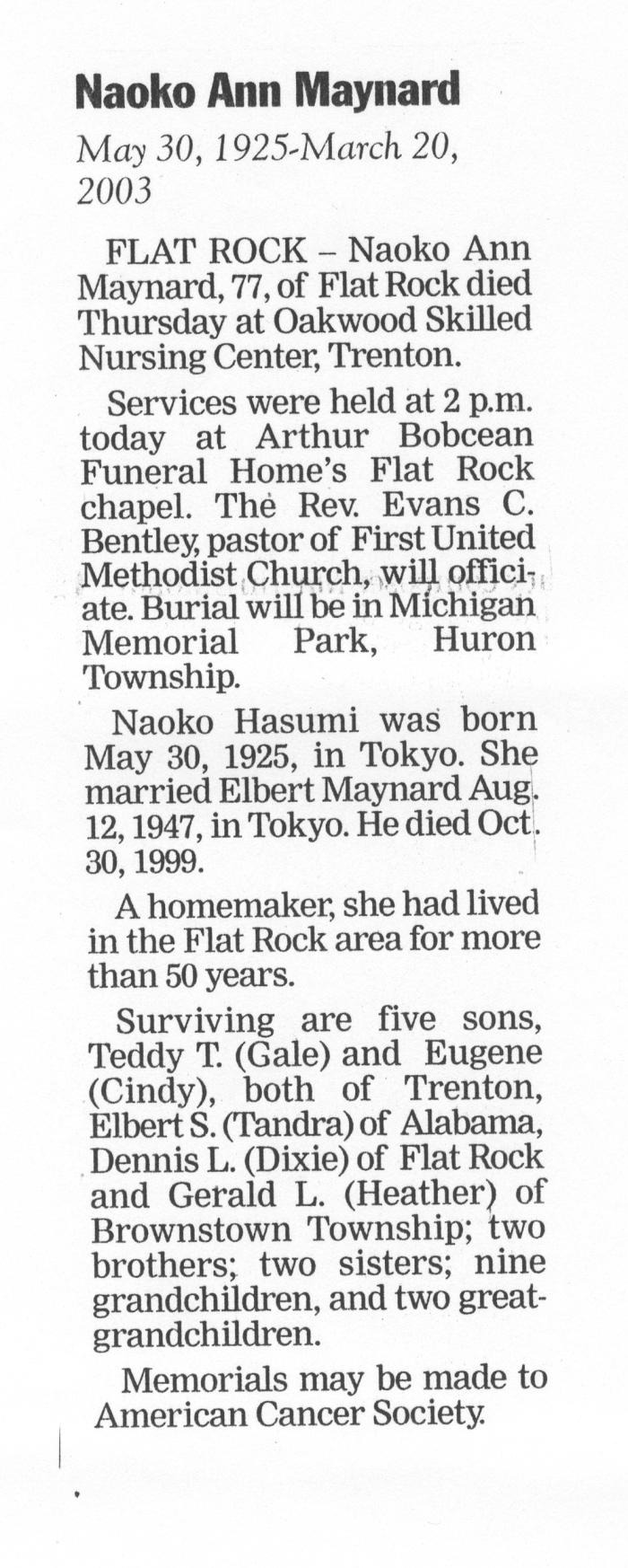 Obituary of Naoko Ann Maynard born May 30, 1925 in Tokyo, Japan. Resided in Flat Rock, Michigan.