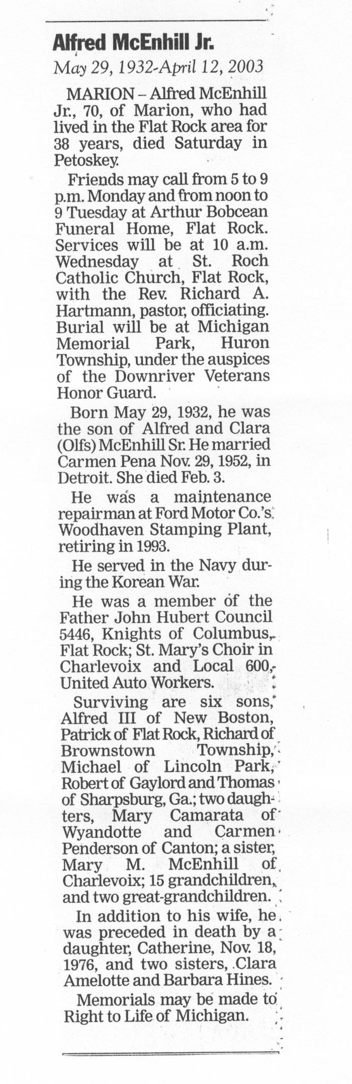 Obituary of Alfred McEnhill JR. born May 29, 1932 in Detroit, Michigan. Resided in Flat Rock, Michigan.