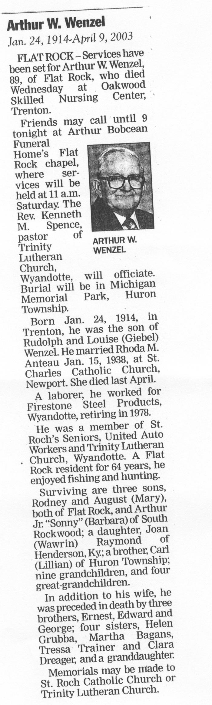 Obituary of Arthur W. Wenzel born January 24, 1914 in Trenton, Michigan. Resided in Flat Rock, Michigan.