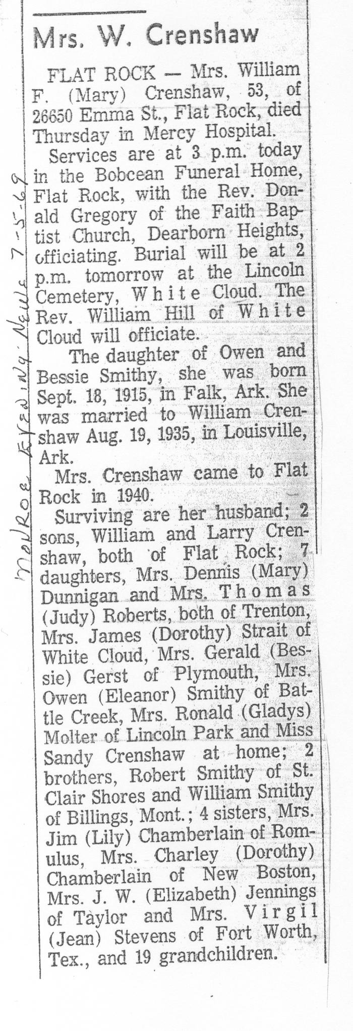 Obituary of Mrs. William F. Mary Crenshaw born Sept. 18, 1915 in Falk, Arkansas. Resided in Flat Rock, Michigan.