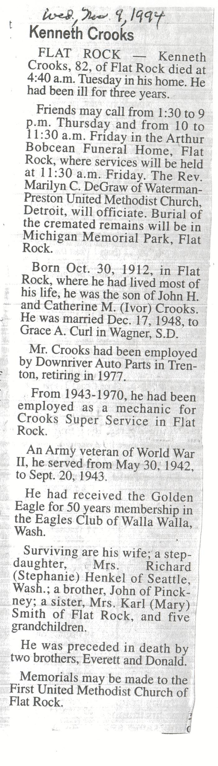 Obituary of Kenneth Cook born Oct.30, 1912 in Flat Rock, Michigan. Resided in Flat Rock, Michigan.