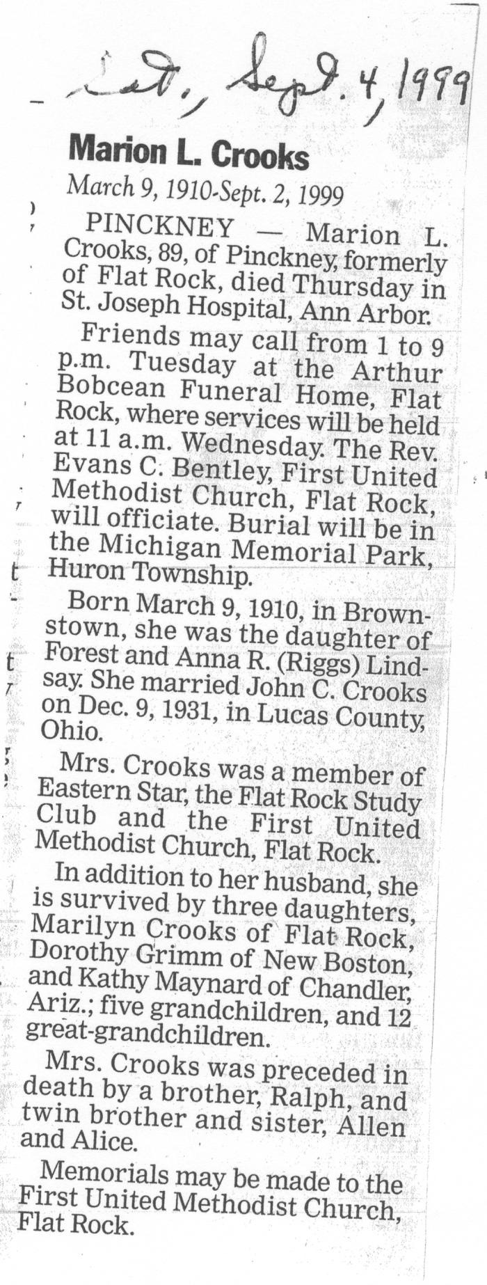 Obituary of Mrs. Marion L. Crooks born March 9, 1910 in Brownstown, Michigan. Resided in Flat Rock and Pinckney, Michigan.