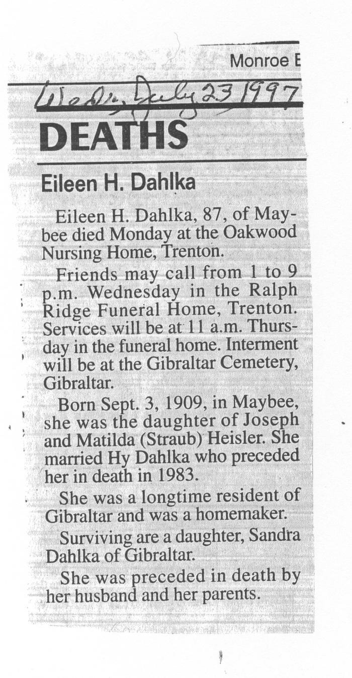 Obituary of Eileen H. Dahlka born Sept. 3, 1909 in Maybee, Michigan. Resided in Maybee, Michigan.