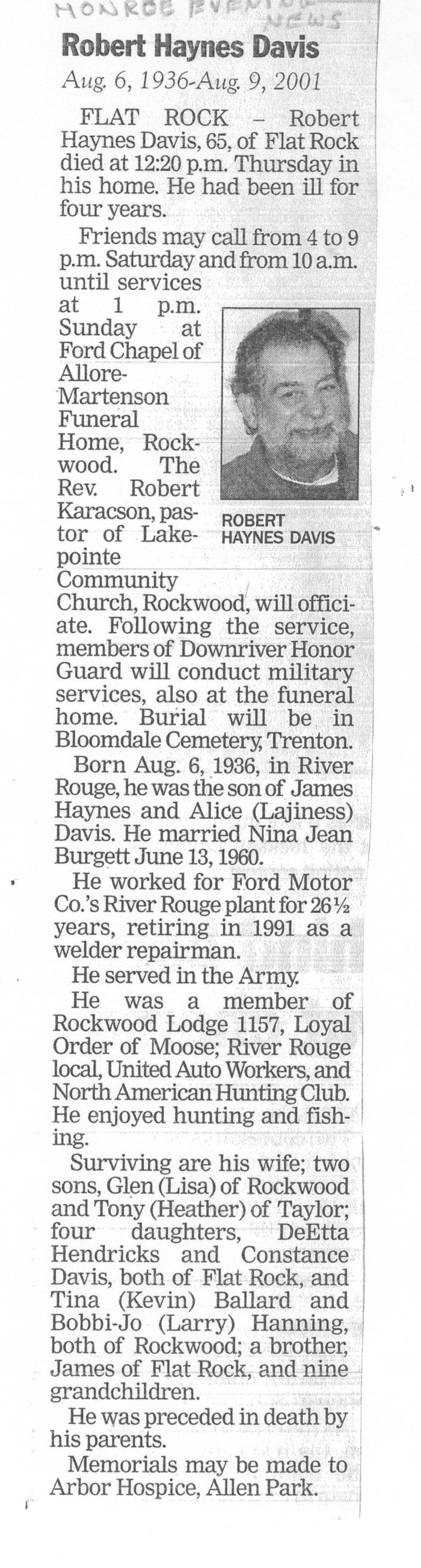 Obituary of Robert Haynes Davis born Aug. 6, 1936 in River Rouge, Michigan. Resided in Flat Rock, Michigan.