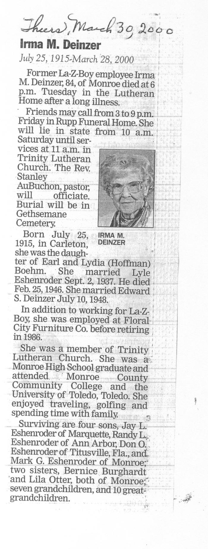 Obituary of Irma M. Deinzer born July 25, 1915 in Carleton, Michigan. Resided in Monroe, Michigan.