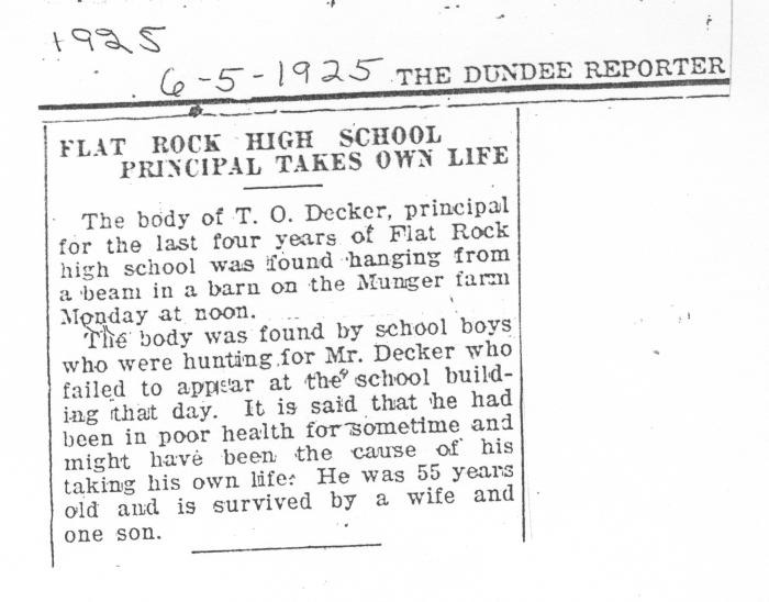 Obituary of T.O. Decker . Resided in Flat Rock, Michigan.