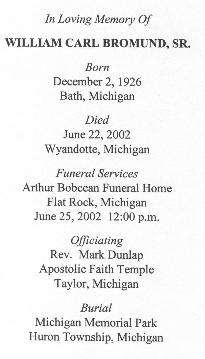 Obituary of William Carl Bromund Sr. born Dec. 2, 1926 in Bath, Michigan. Resided in Flat Rock, Michigan.