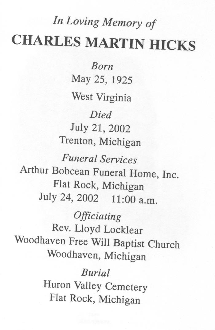Obituary of Charles Martin Hicks born May 25, 1925 in West Virginia. Resided in Flat Rock, Michigan.