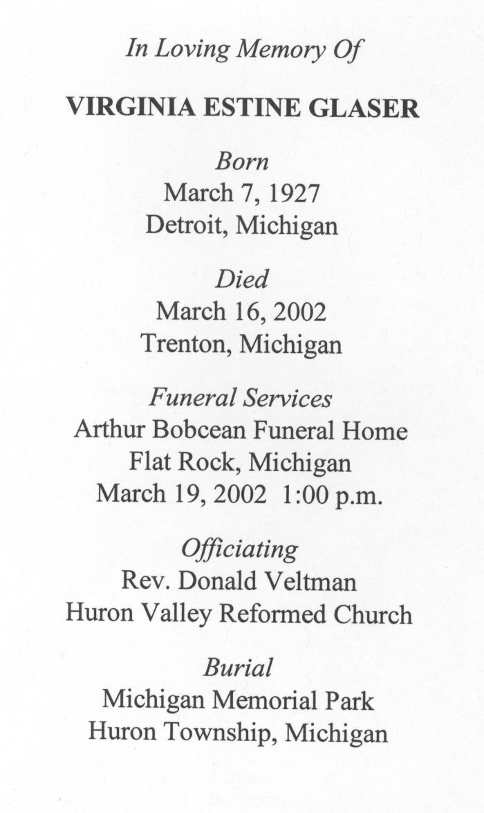 Obituary of Virginia Estine Glasser born March 7, 1927 in Trenton, Michigan. Resided in Flat Rock, Michigan.