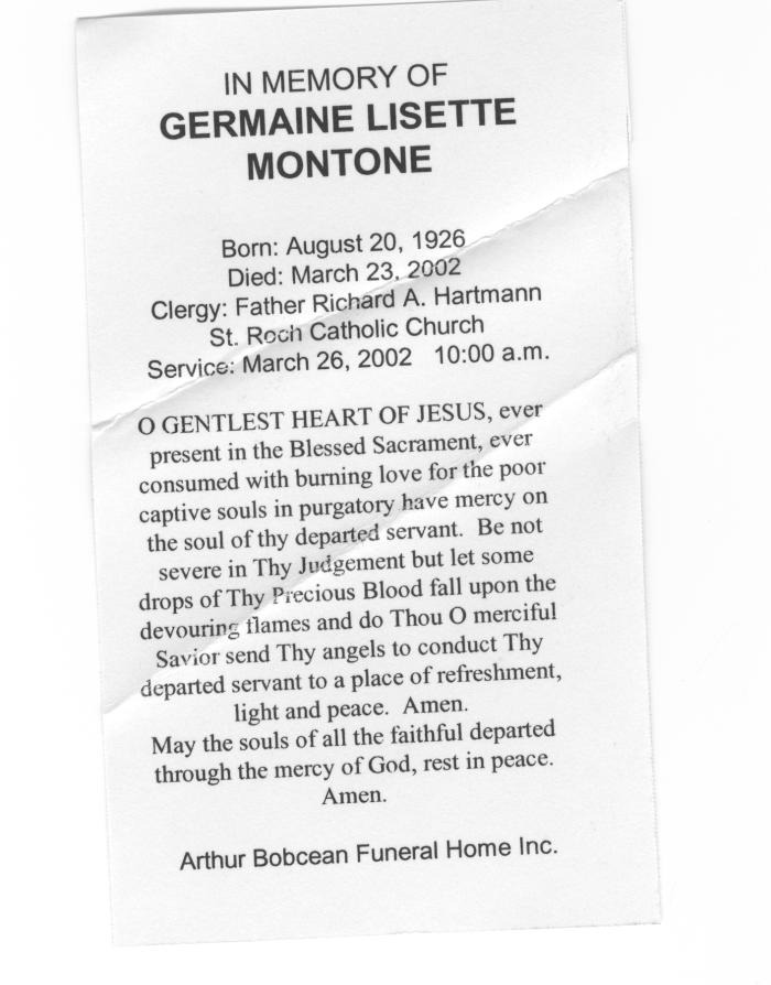 Obituary of Germaine Lissett Montone born Aug.20, 1926.