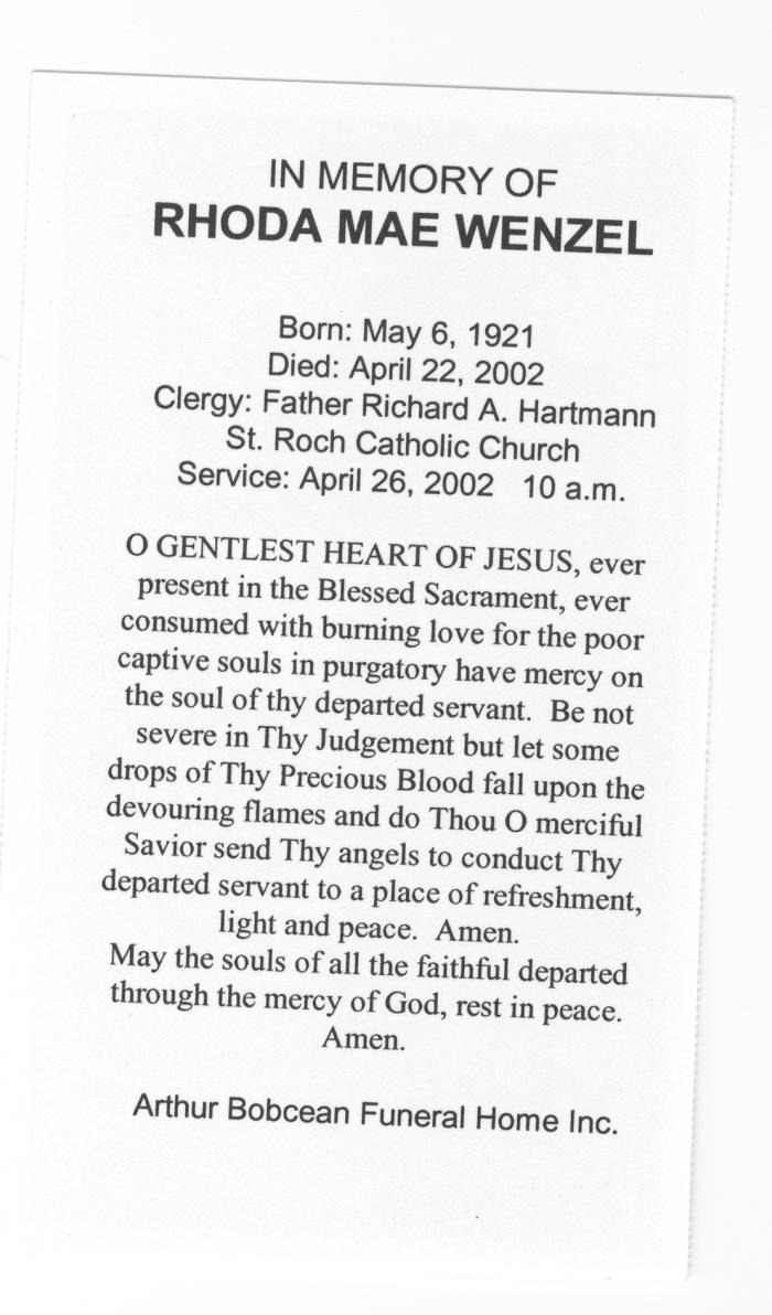 Obituary of Rhoda Mae Wenzel born May 6, 1921.