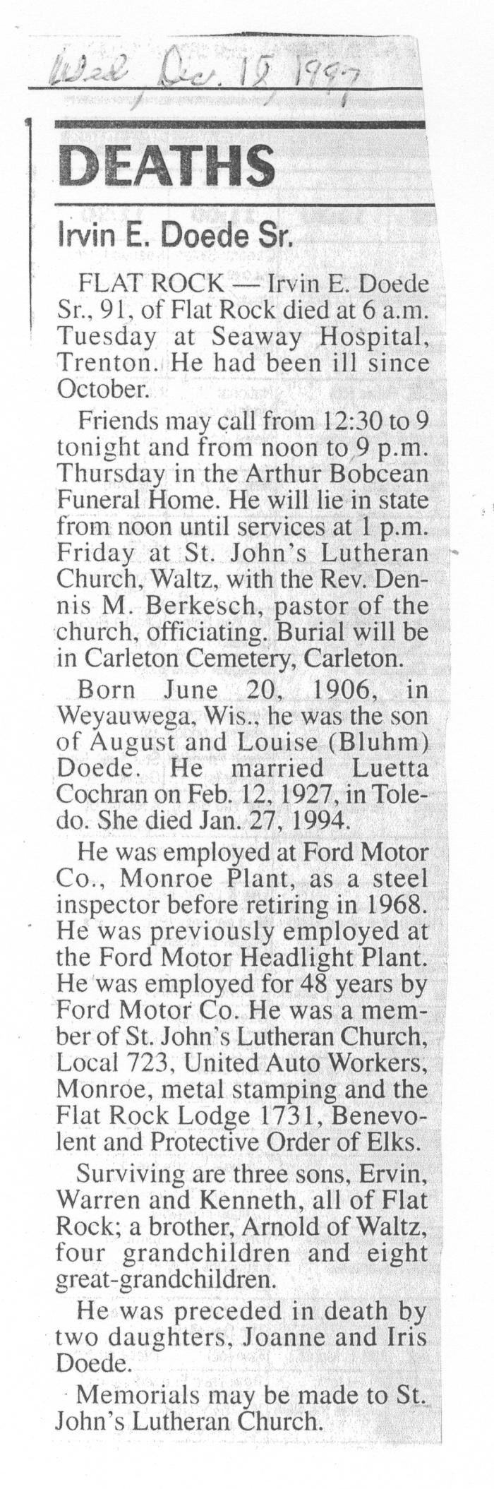 Obituary of Irvine E. Doedo Sr. born June 20, 1906 in Weyauwega, Wisconsin. Resided in Flat Rock, Michigan.