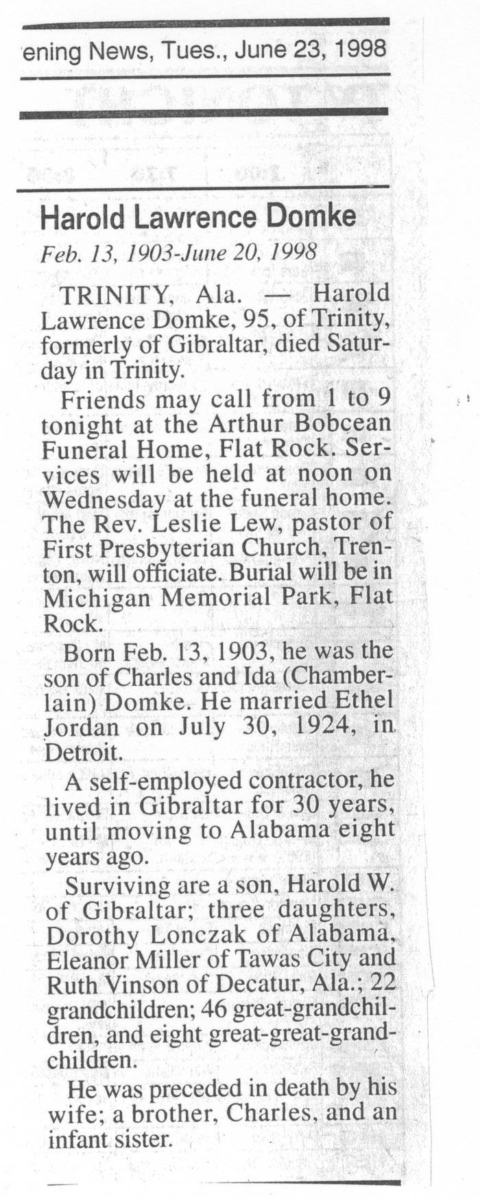 Obituary of Harold Lawrence Domke born Feb.13, 1903 in Detroit, Michigan. Resided in Flat Rock, Michigan.
