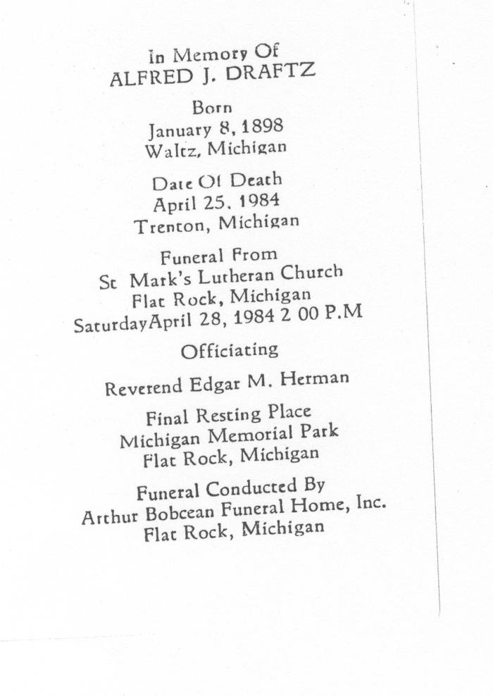 Obituary of Alfred J. Draftz born Jan. 8, 1898 in Waltz, Michigan. Resided in Flat Rock, Michigan.