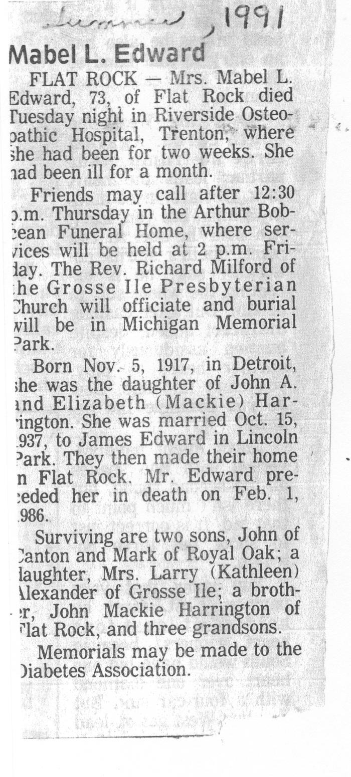 Obituary of Mrs. Mable L. Edward born Nov.5, 1917 in Detroit, Michigan. Resided in Flat Rock, Michigan.
