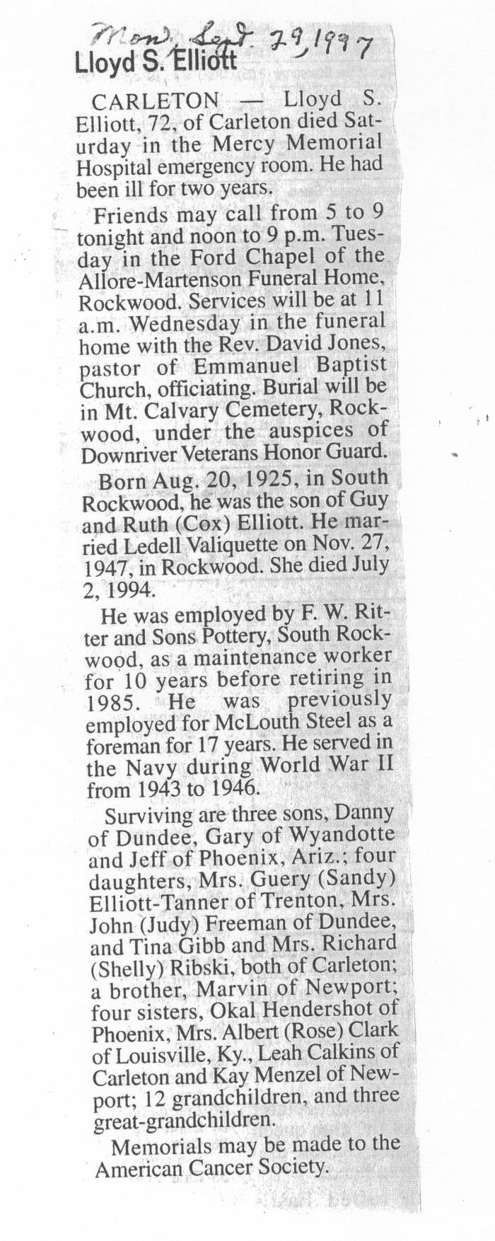 Obituary of Lloyd S. Eliot born Aug.20, 1925 in South Rockwood, Michigan. Resided in Carleton, Michigan.