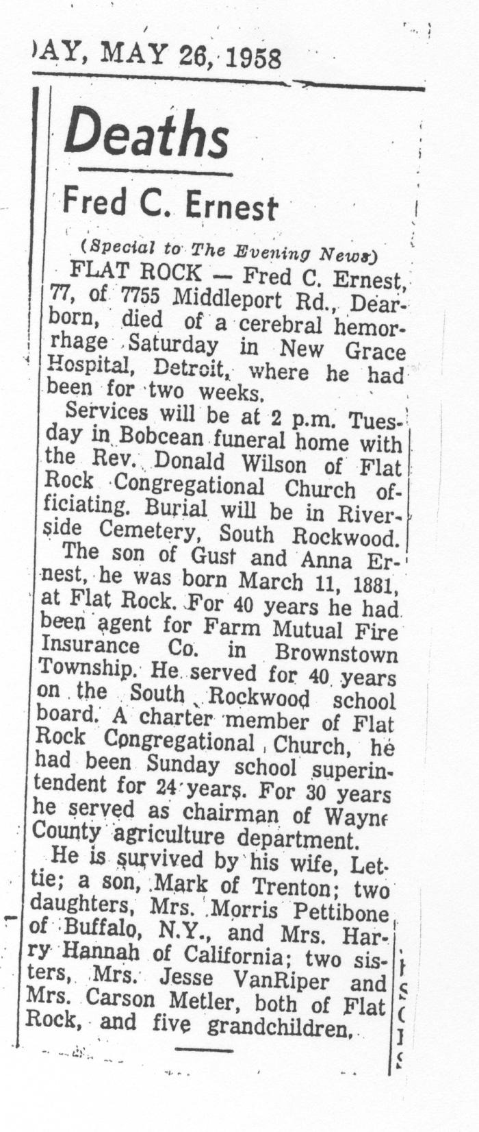 Obituary of Fred C. Ernest born March 11, 1881 in Flat Rock, Michigan. Resided in South Rockwood and Dearborn, Michigan.
