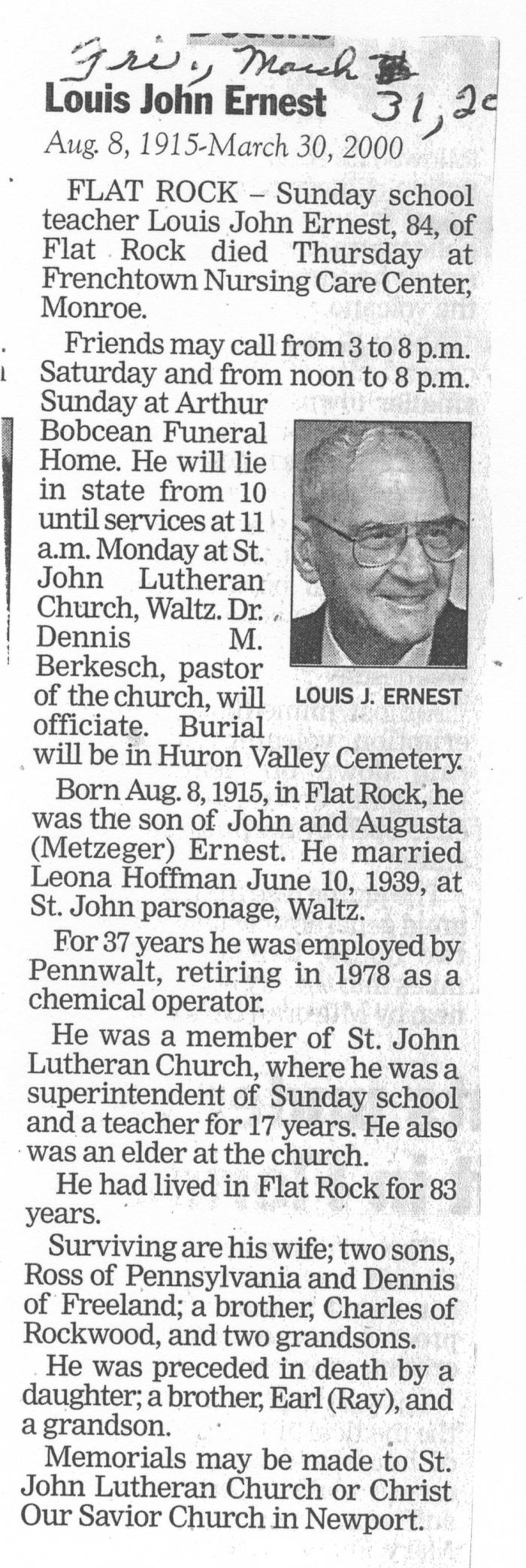 Obituary of Louis John Ernest born Aug. 8, 1915 in Flat Rock, Michigan. Resided in Flat Rock, Michigan.