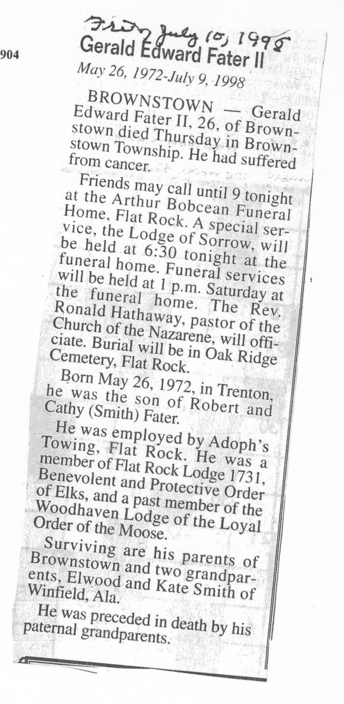Obituary of Gerald Edward Fater II born May 26, 1972 in Trenton, Michigan. Resided in Brownstown Township, Michigan.