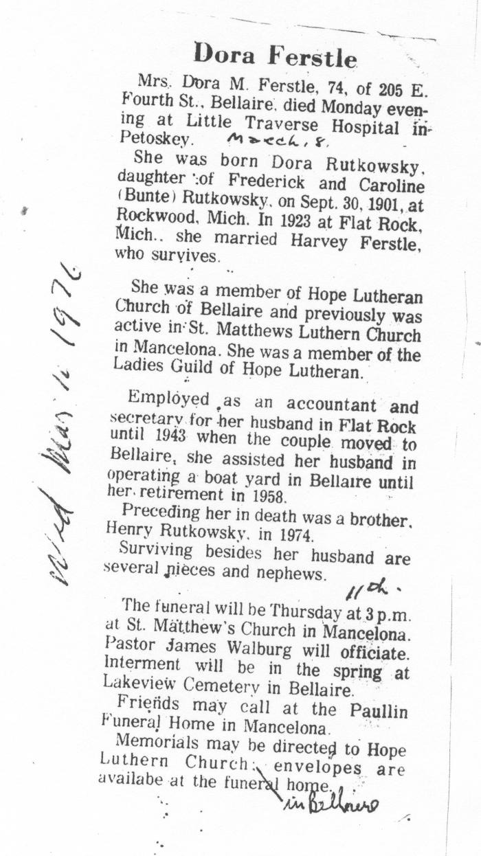 Obituary of Doar Ferstle born Sept. 30, 1901 in Rockwood, Michigan. Resided in Flat Rock and Bellaire Michigan.