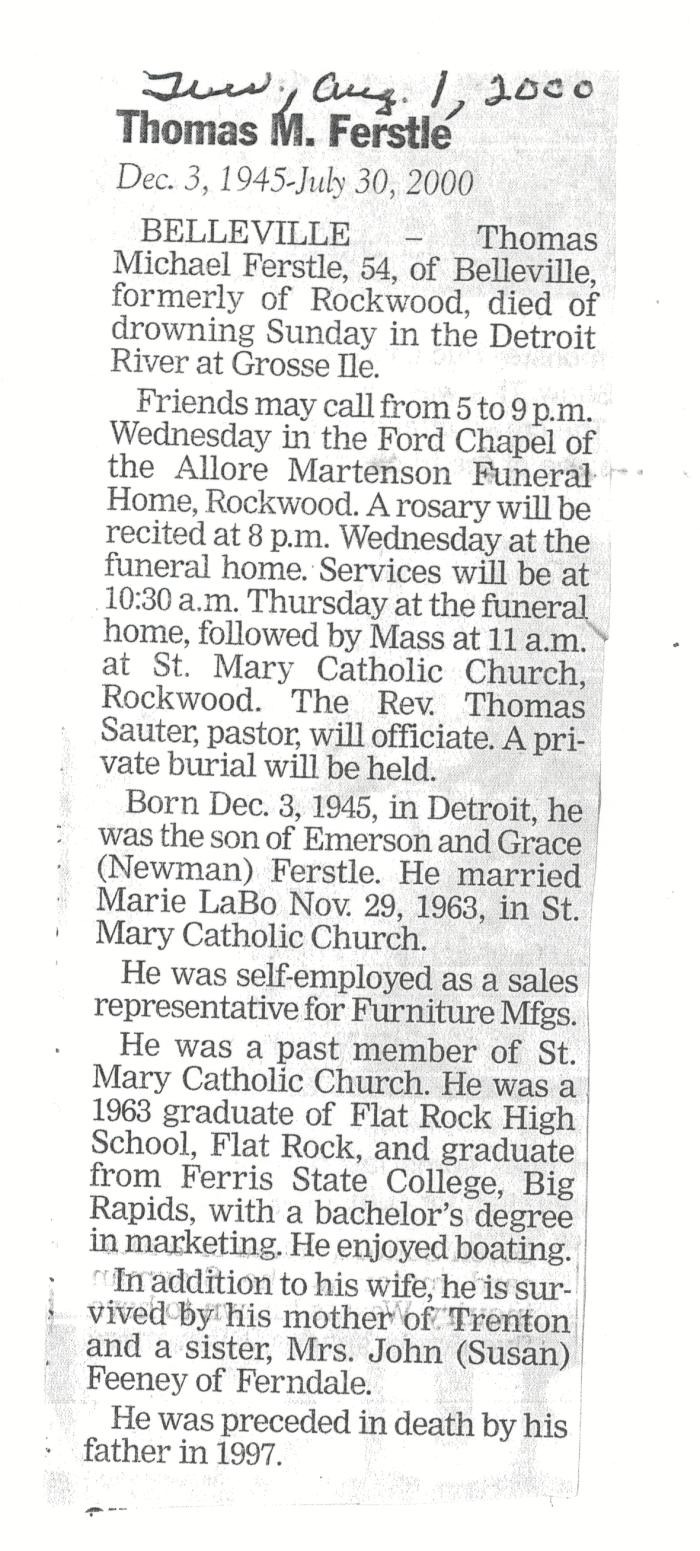 Obituary of Thomas M. Ferstle born Dec. 3, 1945 in Detroit, Michigan. Resided in Rockwood and Belleville, Michigan.