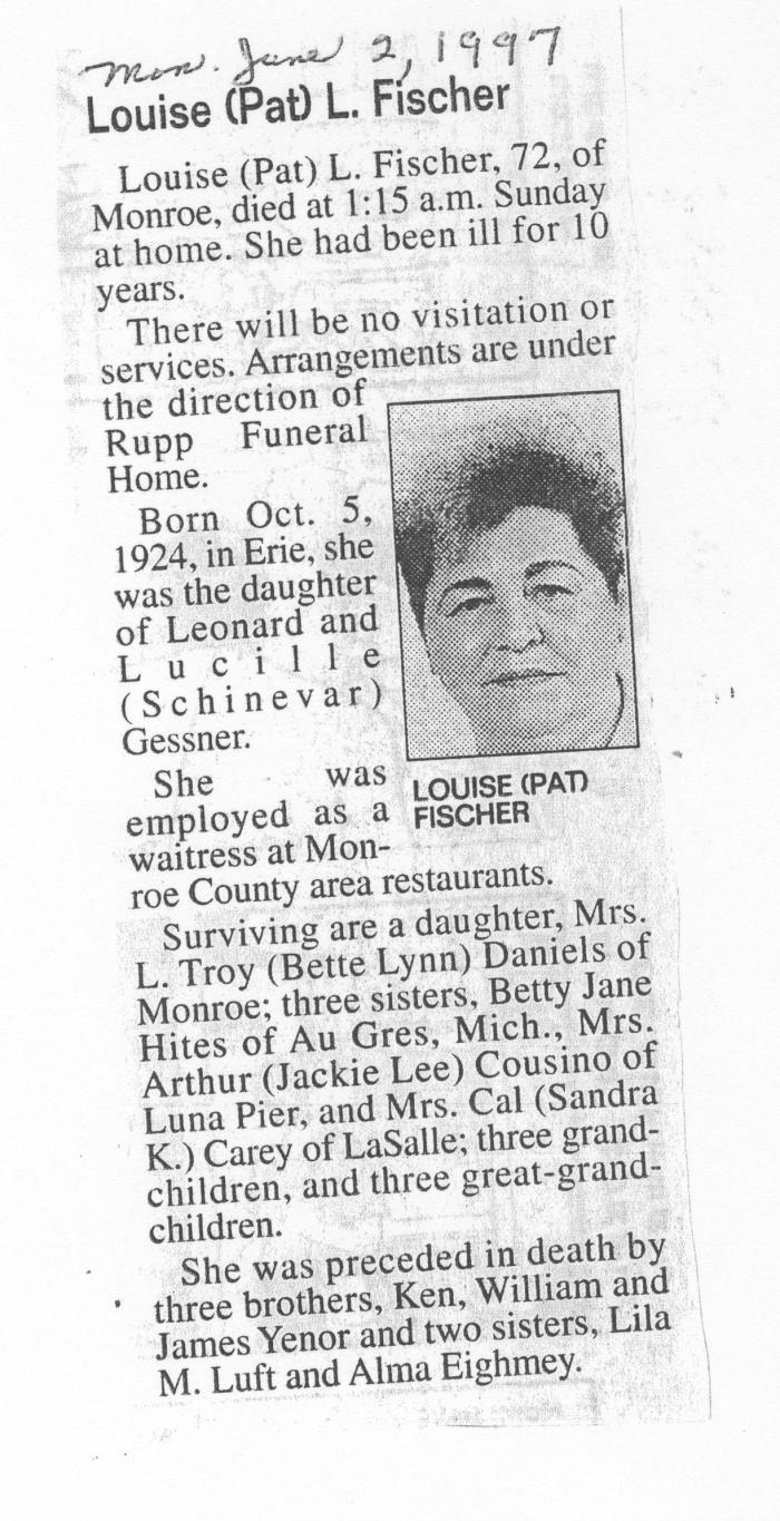Obituary of Louise (Pat) Fischer born Oct. 5, 1924 in Erie, Michigan. Resided in Monroe, Michigan.