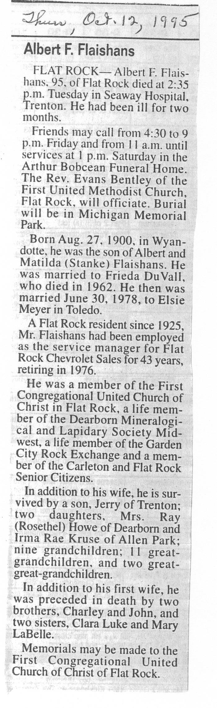 Obituary of Alfred F. Flaishans born Aug. 27, 1900 in Wayndotte, Michigan. Resided in Flat Rock, Michigan.