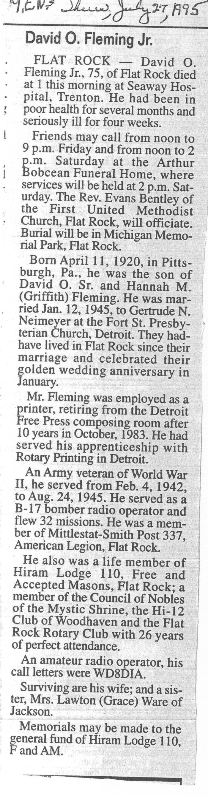 Obituary of David O. Fleming Jr. born July 27, 1995 in Pittsburgh , Pennsylvania. Resided in Flat Rock, Michigan.
