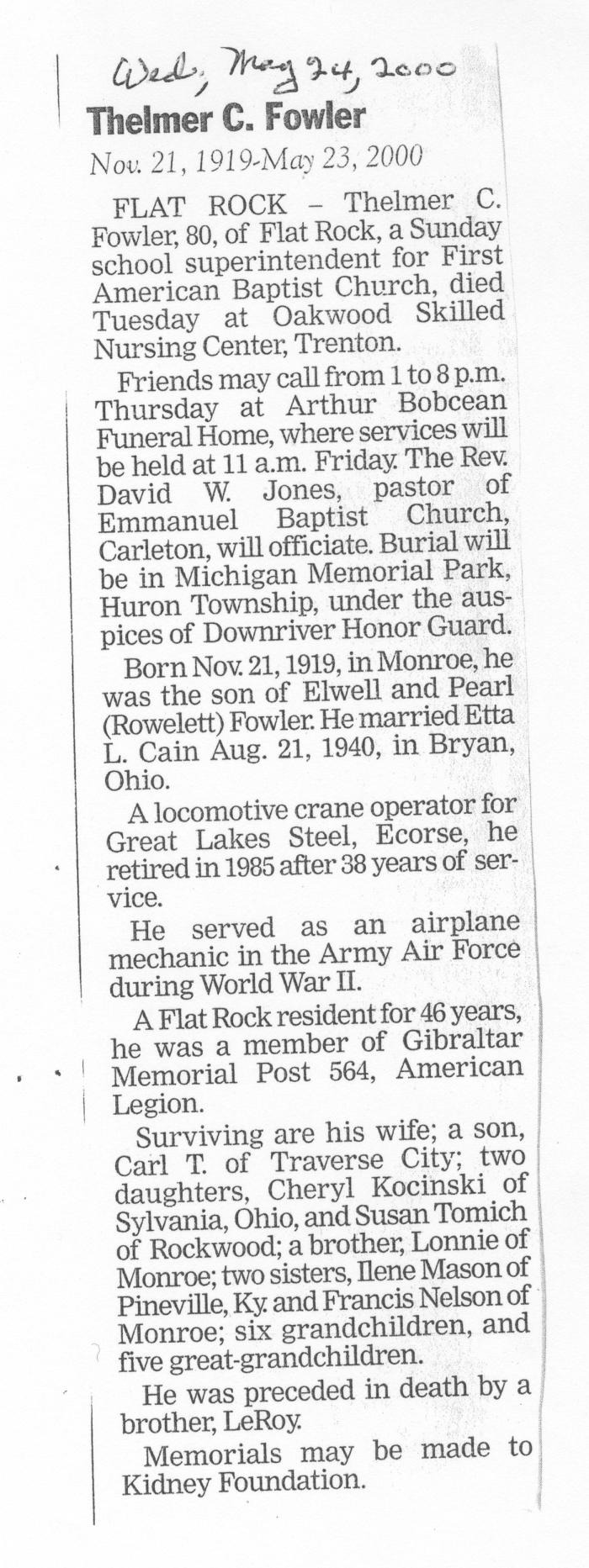 Obituary of Thelmer C. Fowler born Nov. 21, 1919 in Monroe, Michigan. Resided in Flat Rock, Michigan.