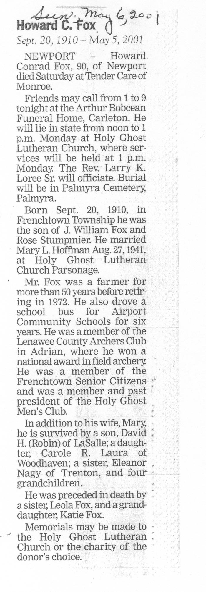 Obituary of Howard Conrad Fox born Sept. 20, 1910 in Frenchtown, Michigan. Resided in Newport, Michigan.