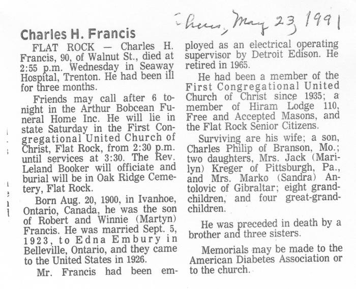 Obituary of Charles H.Francis born Aug. 20, 1900 in Ivanhoe, Ontario, Canada. Resided in Flat Rock, Michigan.