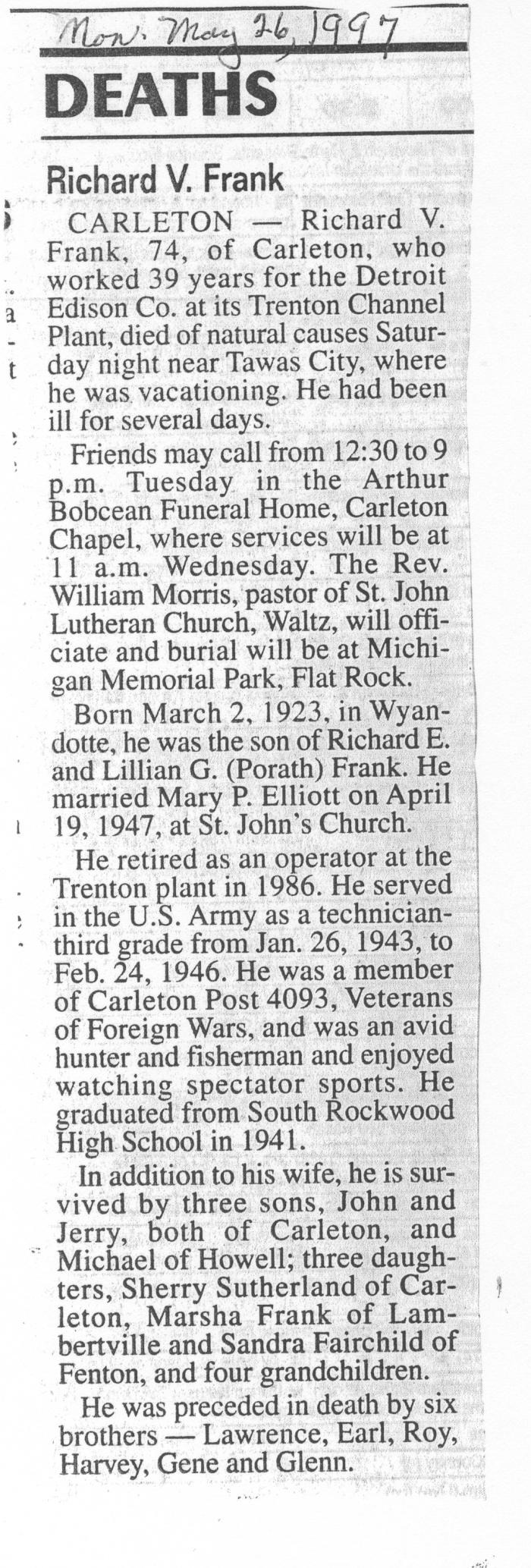Obituary of Richard V. Frank born March 2, 1923 in Wyandotte, Michigan. Resided in Carleton, Michigan.