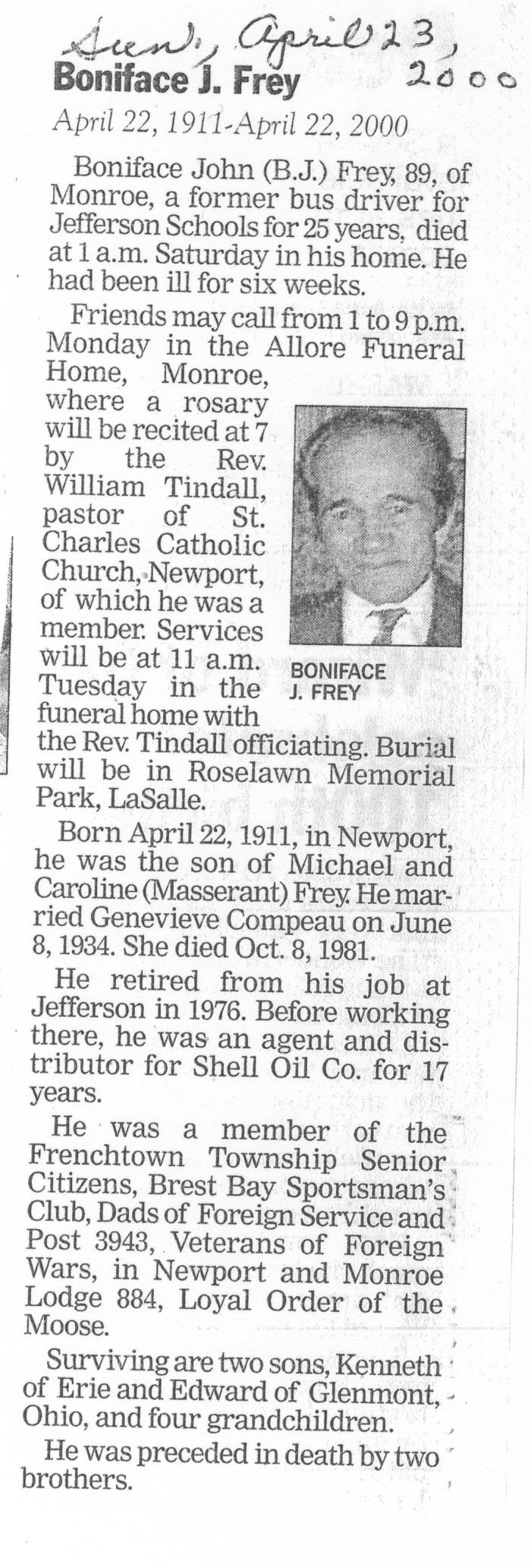 Obituary of Boniface J. Frey born April 22, 1911 in Newport, Michigan. Resided in Monroe, Michigan.