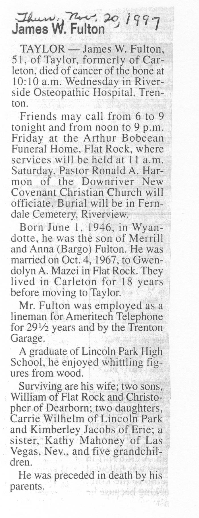 Obituary of James W. Fulton born June 1, 1946 in Wyandotte, Michigan. Resided in Carleton, Michigan.