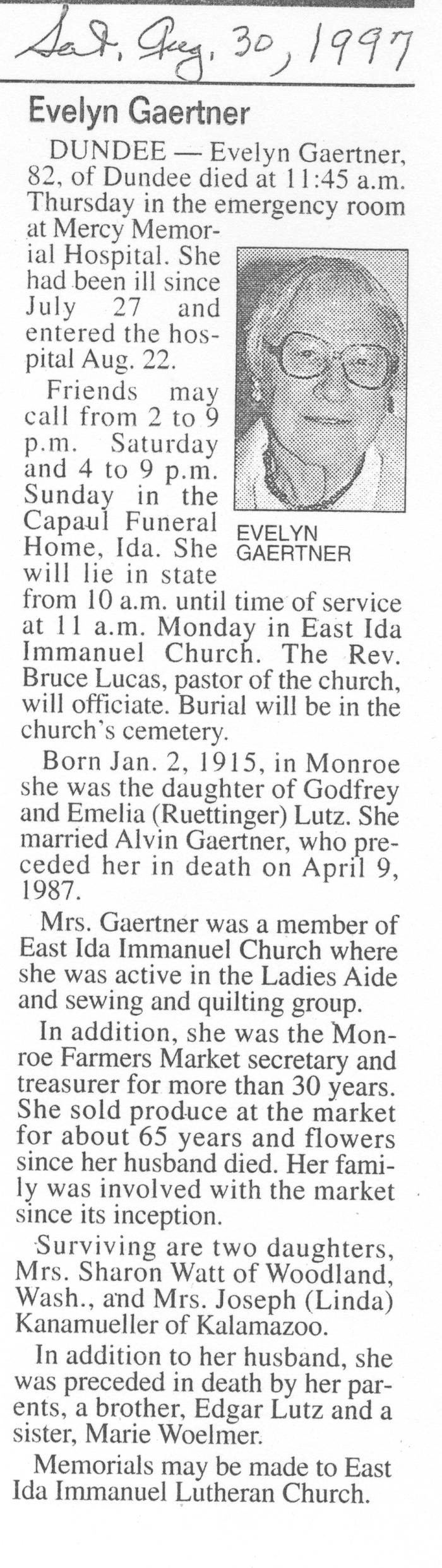Obituary of Evelyn Gaetner born Jan. 2, 1915 in Monroe, Michigan. Resided in Dundee, Michigan.