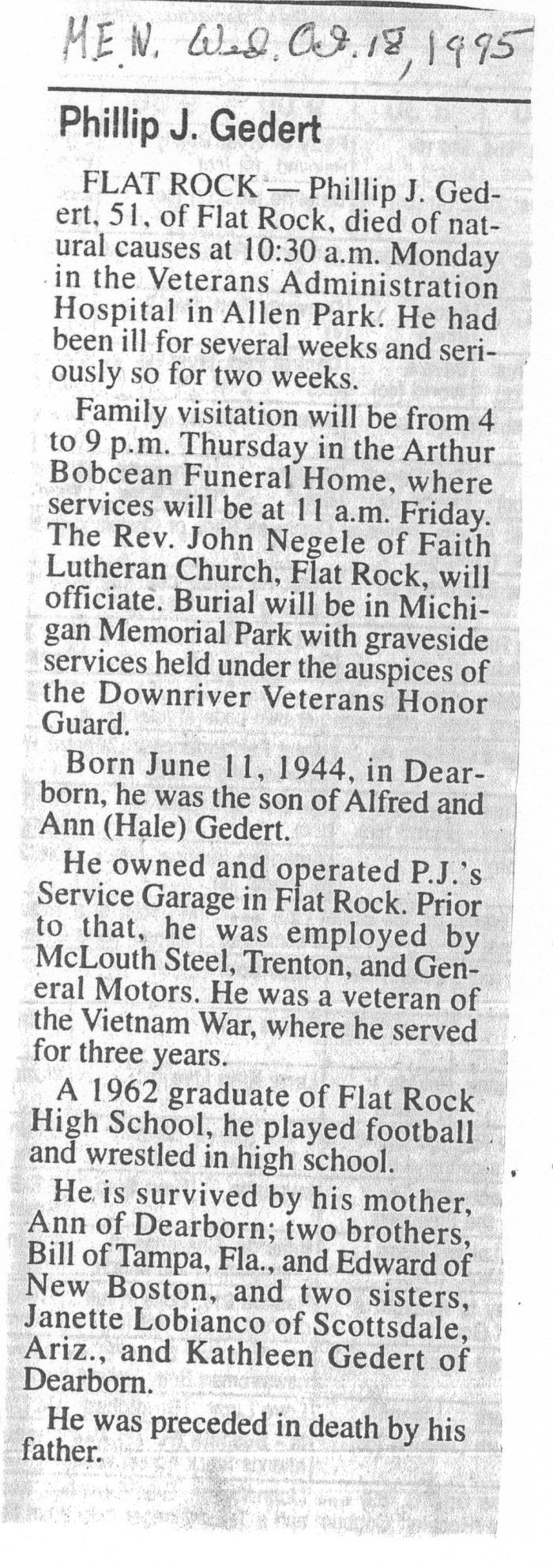 Obituary of Phillip J.Gedert born June 11, 1944 in Dearborn, Michigan. Resided in Flat Rock, Michigan.