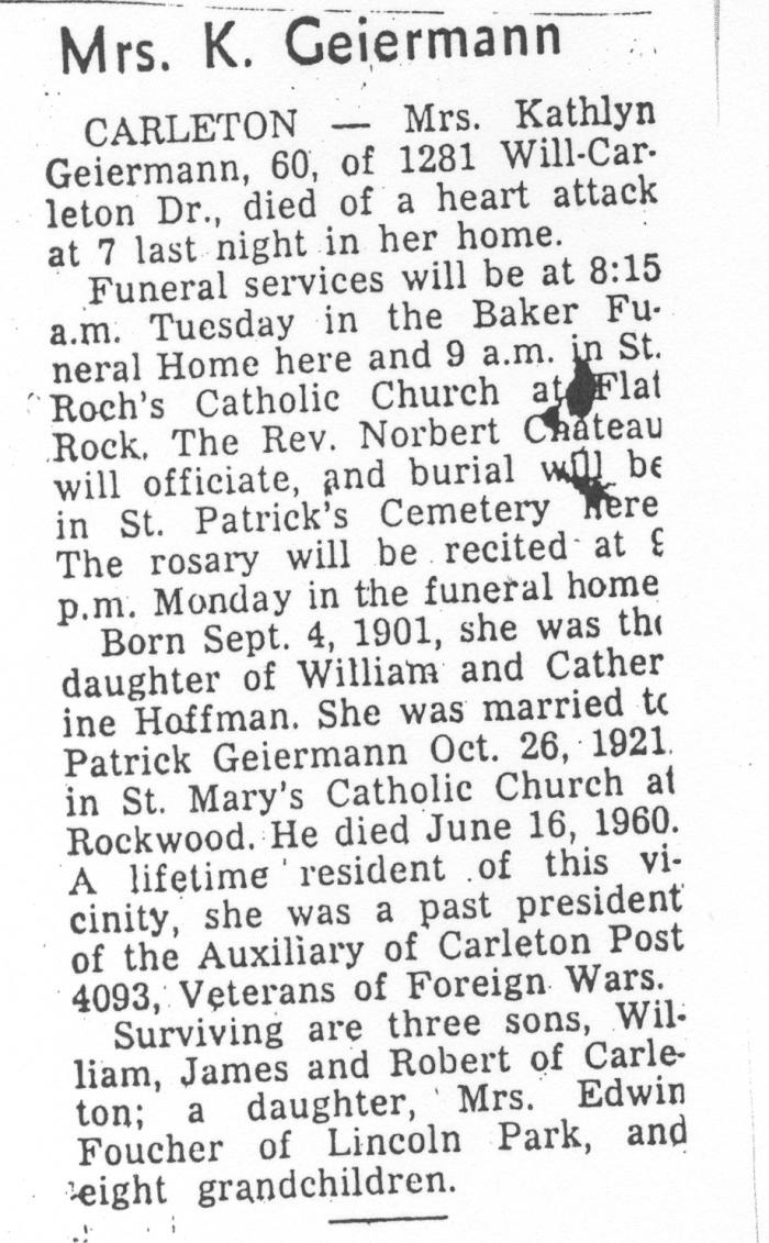 Obituary of Kathlyn Geiermann. Resided in Flat Rock, Michigan.