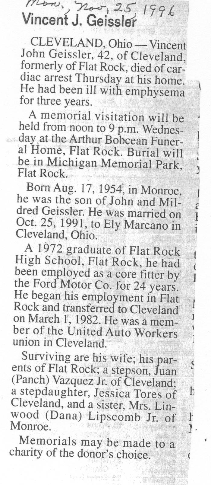 Obituary of Vincent J. Geissler born August 17, 1954 in Monroe, Michigan. Resided in Flat Rock, Michigan.
