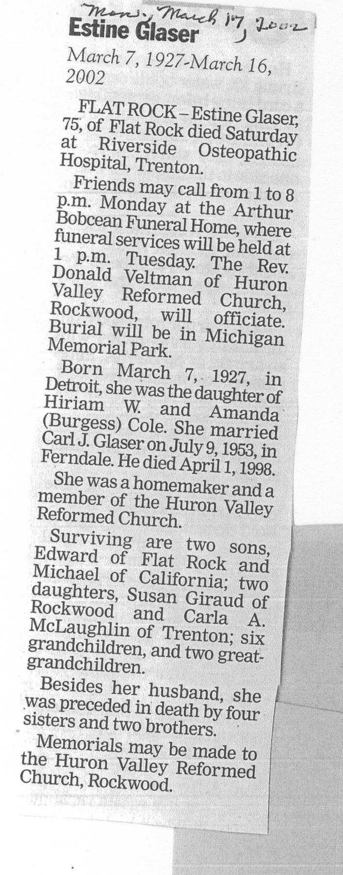 Obituary of Estine Glaser born March 7, 1927 in Detroit, Michigan. Resided in Flat Rock, Michigan.