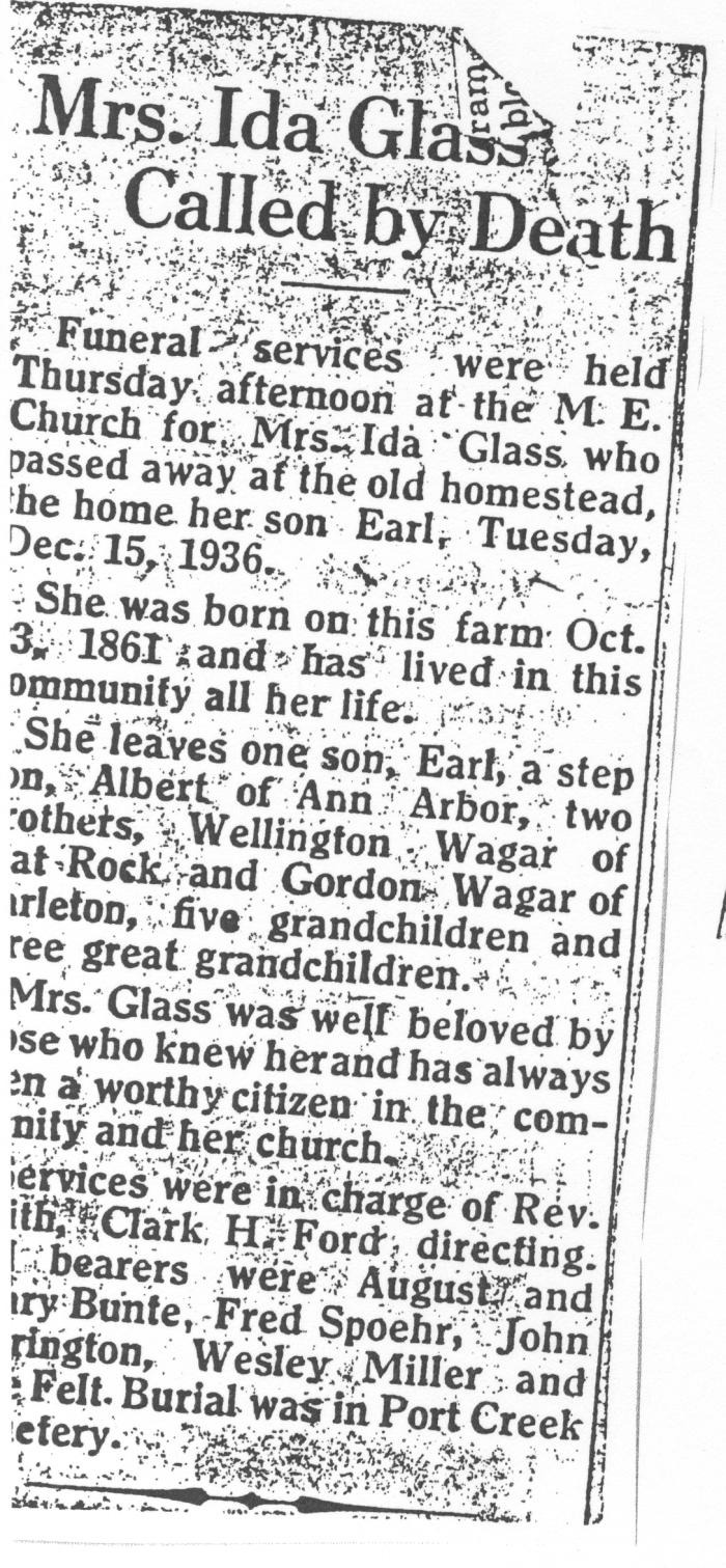 Obituary of Mrs. Ida Glass born Oct.3, 1861 in Flat Rock, Michigan.